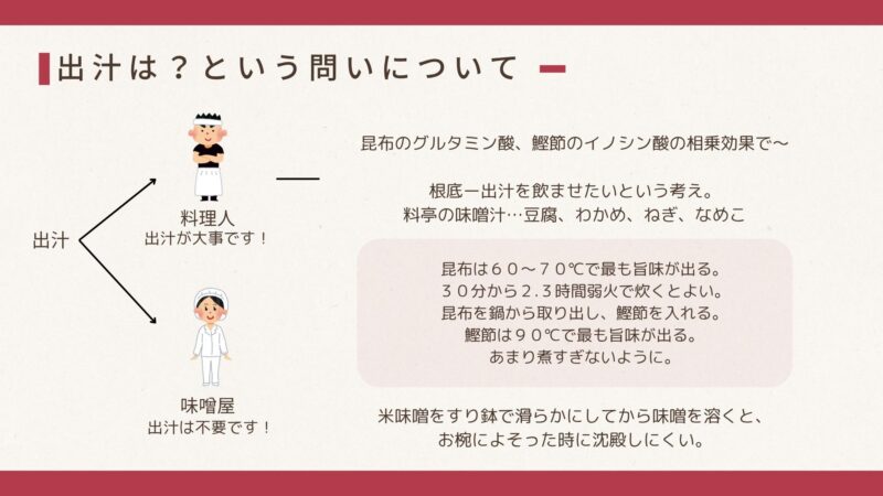 つまりは、ここで発言された料亭の料理人さんがお客様に飲ませたいのは、「お味噌汁」というより「出汁」なんですね。